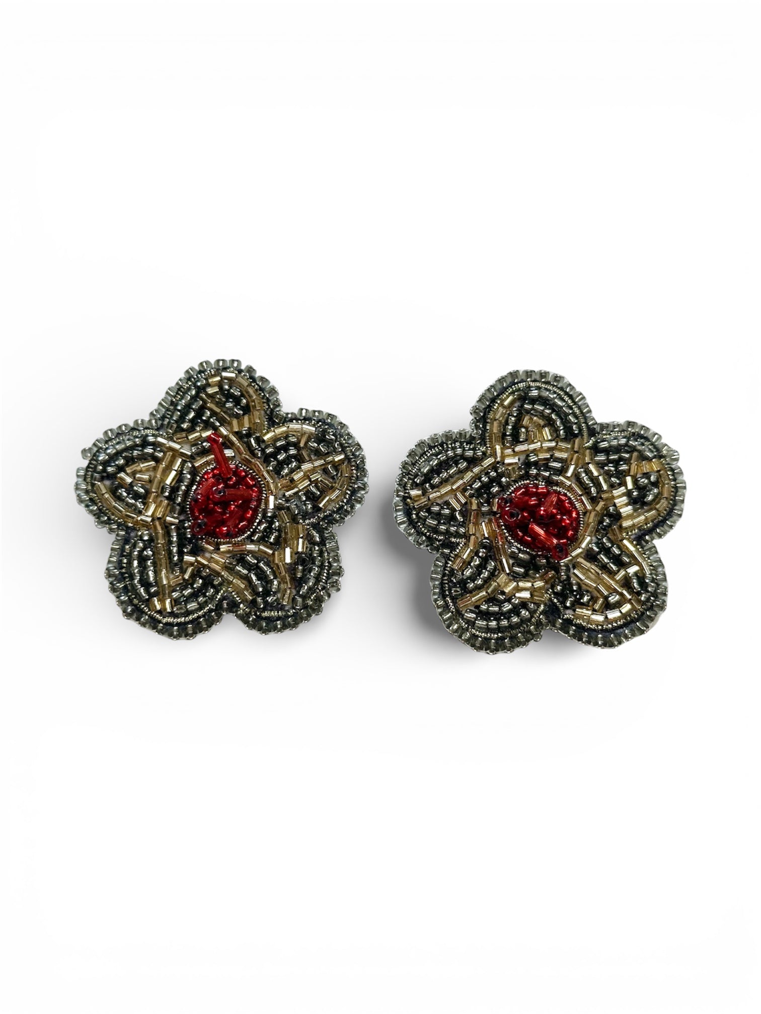A sophisticated floral design featuring shimmering gold and charcoal petals, centered with a deep crimson core. Inspired by the bold elegance of winter blooms.