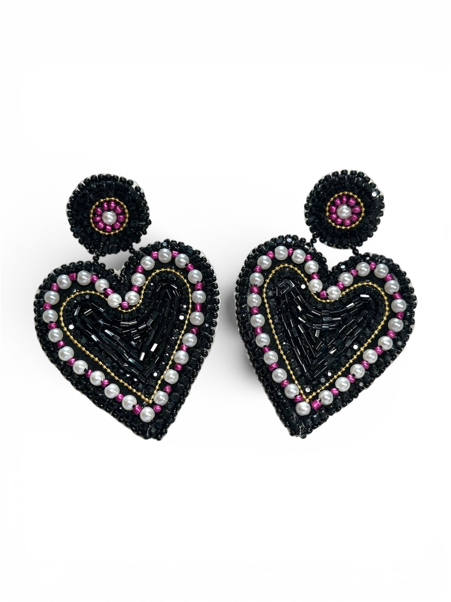 A striking heart-shaped design featuring deep onyx bugle beads framed by a halo of pearls and vibrant fuchsia accents. Inspired by classic romance with a modern, edgy twist.